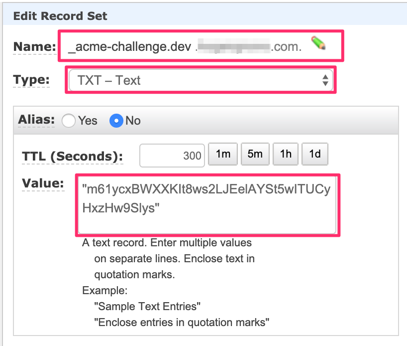 도메인 제공 서비스에서 _acme-challenge.dev.example.com 의 레코드 셋을 만들고, 타입을 TXT로 Value 에 출력된 값을 넣어주면 된다.