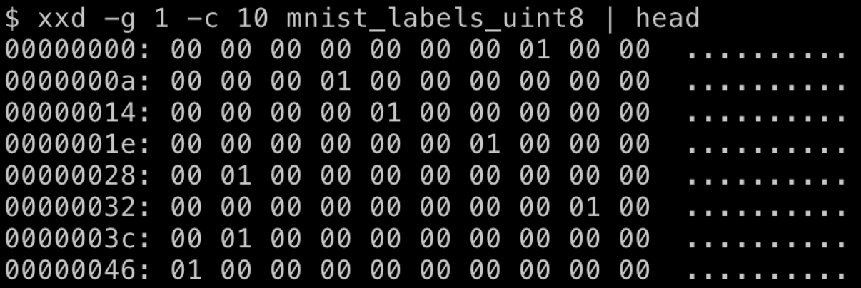 머신러닝 예제를 돌려보고 있는데, 1바이트에 1개의 레이블이 있고 10개씩 묶으로 가져와 처리하는 예제였다.