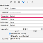 발생일: 2016.03.23 키워드: UITableViewCell, Selection, selectionStyle 문제: 테이블뷰의 셀 터치 시, 포커스되면서 배경이 회색으로 설정된다. 배경과 동일한 컬러의 View도 보이지 않게 되더라. 포커스된 걸 없애고 싶다. 어떻게 하면 되지? 해결책: UITableViewCell 에 선택되었을 때의 설정을 위한 옵션이 있다. 인터페이스 빌더에서는 아래와 같이 Selection 옵션을 None 으로 설정하면 되고, 코드로 추가하는 경우라면 selectionStyle 옵션을 UITableViewCellSelectionStyleNone 상수로 정의해주면 된다. - (void)awakeFromNib { self.selectionStyle = UITableViewCell..