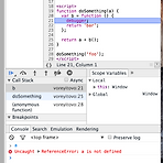 발생일: 2014.12.28 키워드: 크롬 개발자 도구, Chorme Developer Tools, 클로져, 클로저, Free Variable, 자유 변수 문제: 옆자리 D가 개발자 도구로 디버깅할 때 클로저의 변수를 확인할 수 없다며 이상하다고 물어봤다. 대략 아래와 같은 코드였다. function doSomething(a) { var b = function () { debugger; // (A) return 'bar'; }; return a + b(); } doSomething('foo'); (A) 시점에 디버거를 걸어뒀을 때, `doSomething(a)`로 전달받은 매개변수 `a`의 값을 확인할 수 없다는 얘기였다. 실제로 돌려보면 아래와 같이 나온다. 해결책: 위 코드에서 `b` 함수는 클로저(..